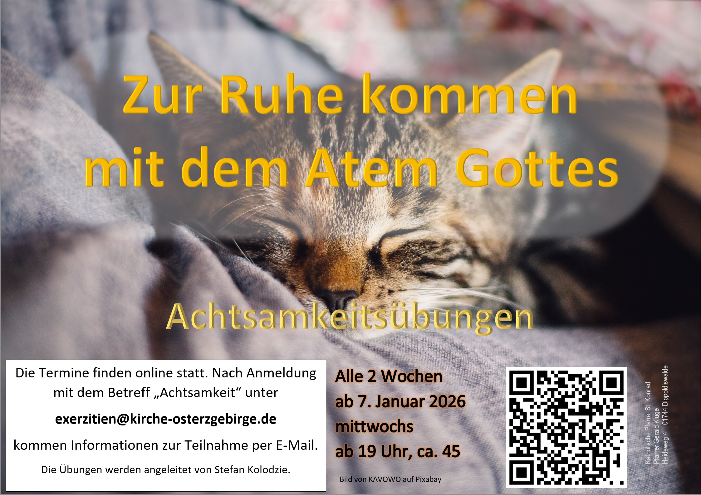 Das Angebot "Zur Ruhe kommen mit dem Atem Gottes" möchte alle einladen, die mit ihren vielen belastenden und sorgenvollen Gedanken kaum zur Ruhe kommen. Jeder Termin kann separat besucht werden; je häufiger allerdings die Teilnahme, umso eher lässt sich die Ruhe finden. Die Termine finden online statt. Es empfiehlt sich, sich an einen ruhigen Ort zu begeben, an dem man für etwa eine Stunde ungestört sein kann. Am einfachsten ist die Teilnahme mit einem Smartphone und Kopfhörern. Dann kann die Übung im Liegen oder Sitzen durchgeführt werden, in einer möglichst entspannten Haltung.